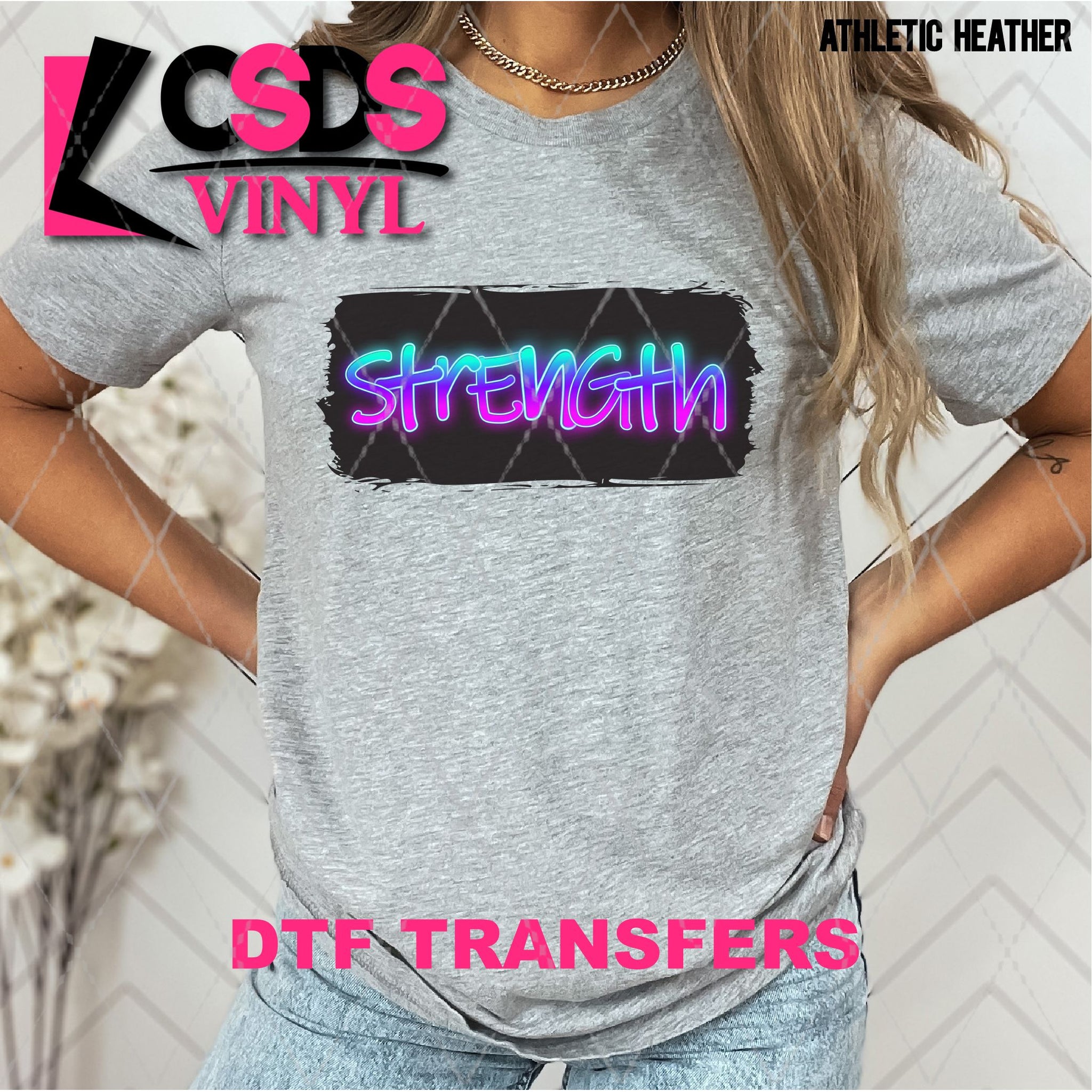 DTF transfers are a type of garment transfer that has been printed using a water-based DTF ink printed onto a clear release paper. This allows the end user the flexibility of when the transfer is applied and what the transfer is applied to. DTF transfers can be made in single color or full color images. Keep in mind that full color transfers will feel slightly thicker than single color transfers simply because more ink is used to create the transfer itself but we do pride ourselves with having some of the thinnest full color DTF transfers on the market. DTF transfers from CSDS Vinyl can be applied to any cotton, polyester, or cotton-poly blend materials.