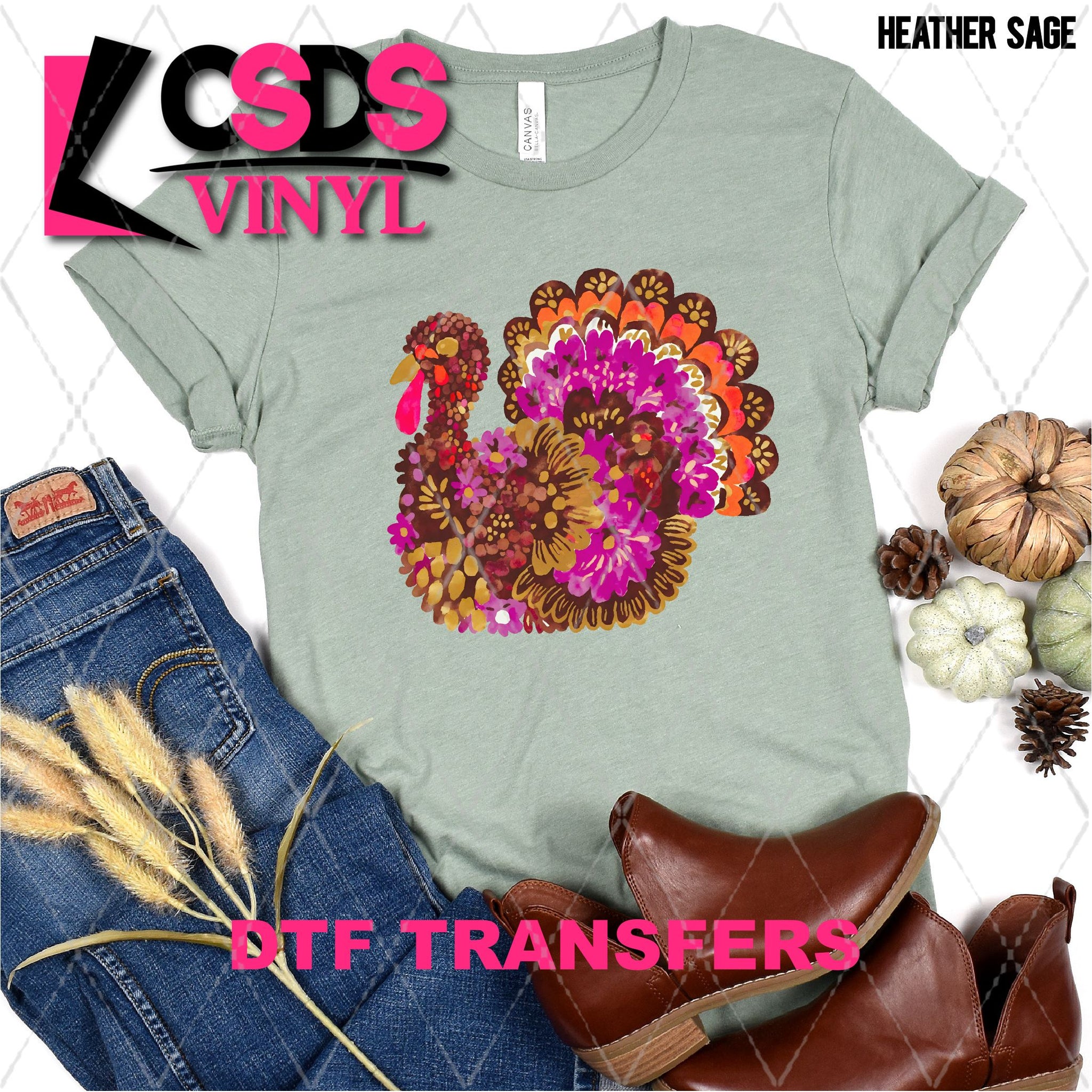 DTF transfers are a type of garment transfer that has been printed using a water-based DTF ink printed onto a clear release paper. This allows the end user the flexibility of when the transfer is applied and what the transfer is applied to. DTF transfers can be made in single color or full color images. Keep in mind that full color transfers will feel slightly thicker than single color transfers simply because more ink is used to create the transfer itself but we do pride ourselves with having some of the thinnest full color DTF transfers on the market. DTF transfers from CSDS Vinyl can be applied to any cotton, polyester, or cotton-poly blend materials.