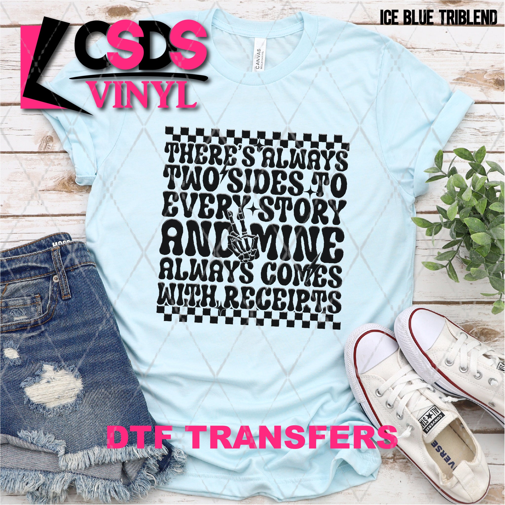 DTF transfers are a type of garment transfer that has been printed using a water-based DTF ink printed onto a clear release paper. This allows the end user the flexibility of when the transfer is applied and what the transfer is applied to. DTF transfers can be made in single color or full color images. Keep in mind that full color transfers will feel slightly thicker than single color transfers simply because more ink is used to create the transfer itself but we do pride ourselves with having some of the thinnest full color DTF transfers on the market. DTF transfers from CSDS Vinyl can be applied to any cotton, polyester, or cotton-poly blend materials.