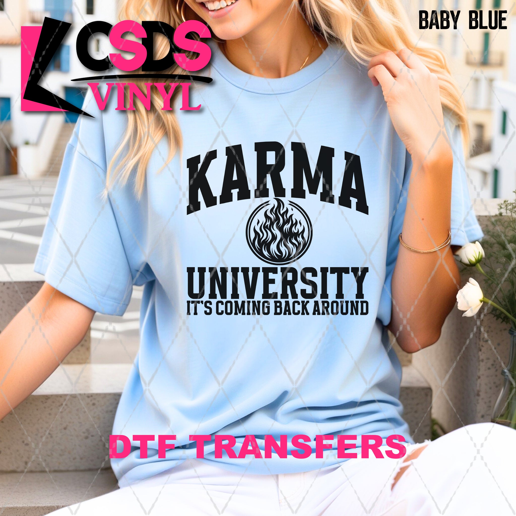 DTF transfers are a type of garment transfer that has been printed using a water-based DTF ink printed onto a clear release paper. This allows the end user the flexibility of when the transfer is applied and what the transfer is applied to. DTF transfers can be made in single color or full color images. Keep in mind that full color transfers will feel slightly thicker than single color transfers simply because more ink is used to create the transfer itself but we do pride ourselves with having some of the thinnest full color DTF transfers on the market. DTF transfers from CSDS Vinyl can be applied to any cotton, polyester, or cotton-poly blend materials.